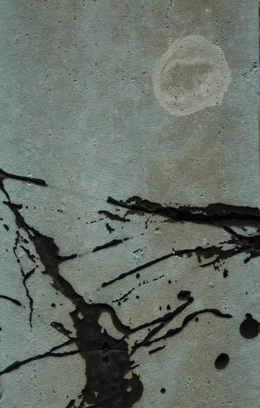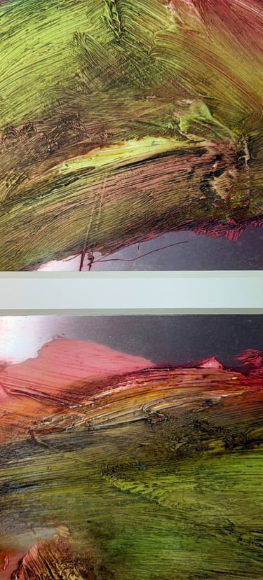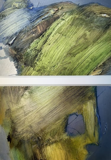 The oil paintings on aluminum are aerial-based images responding to the environmental effects on the surface of the landscape.